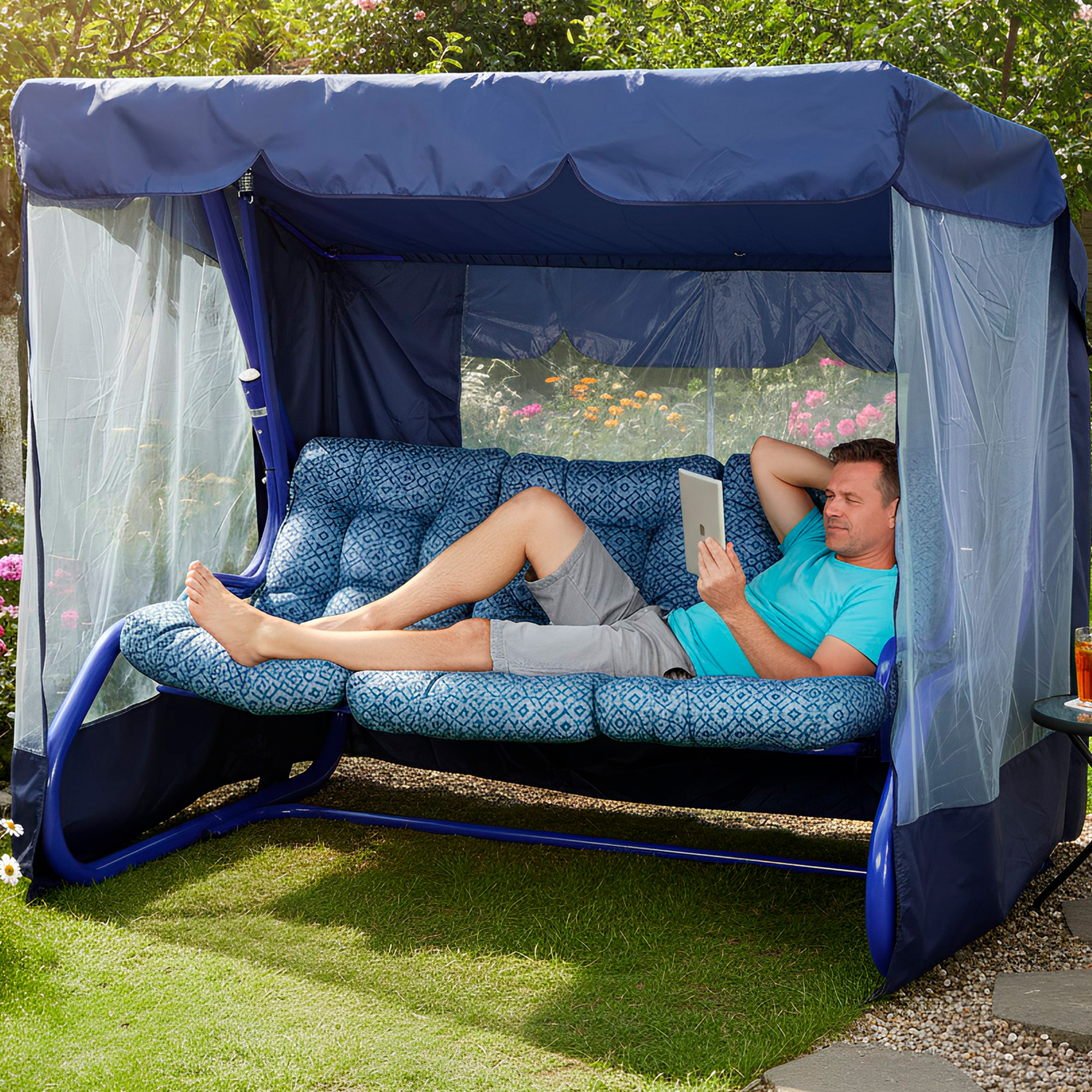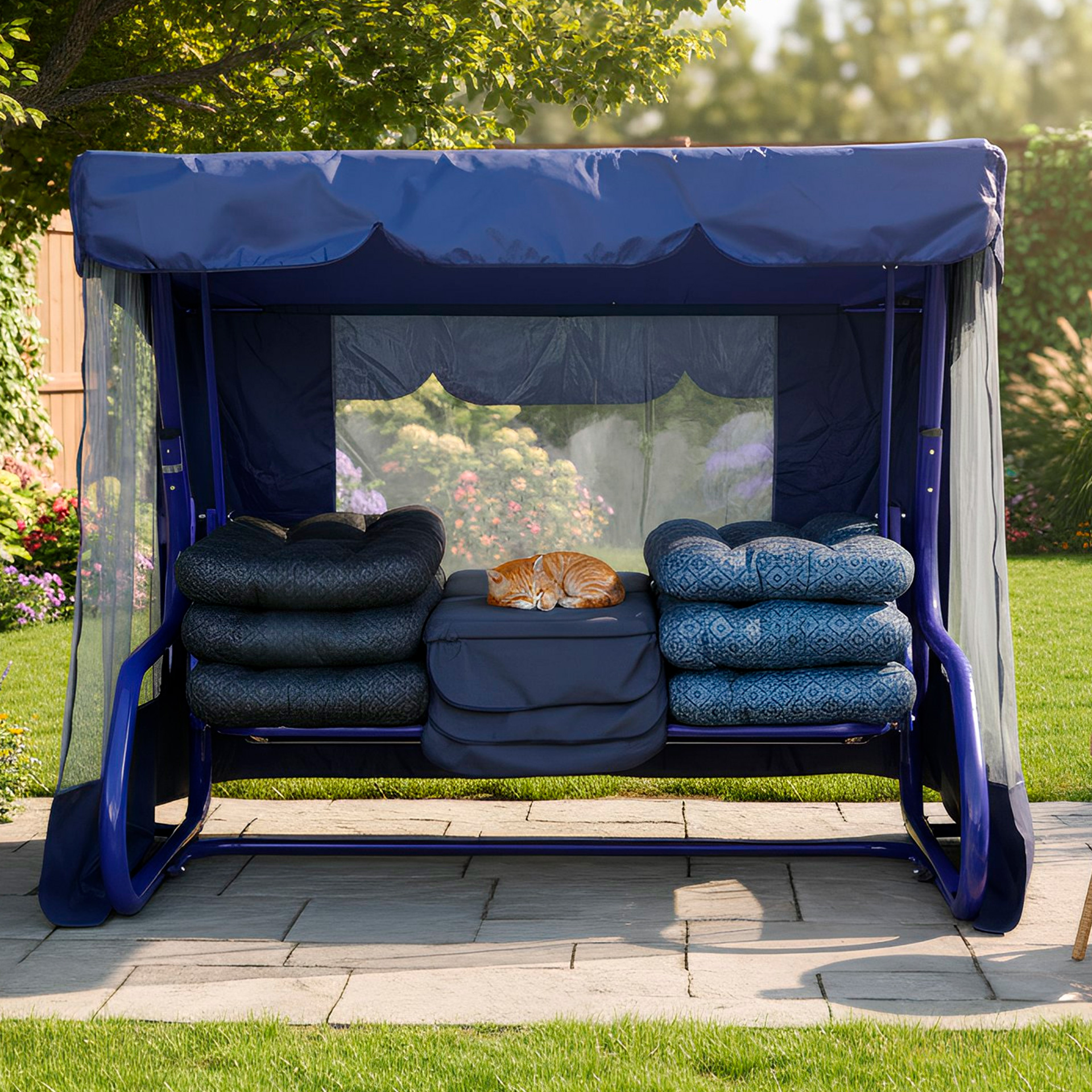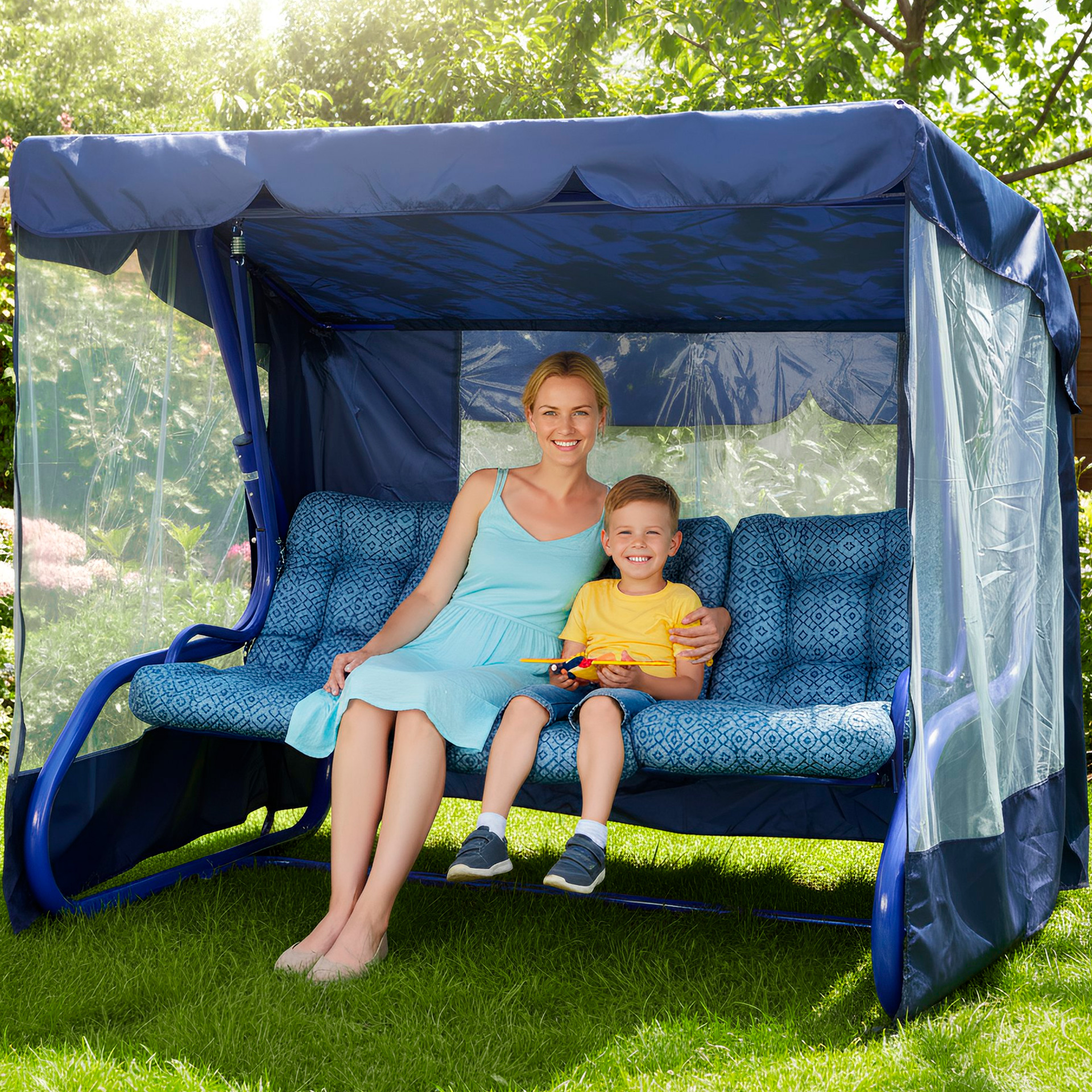Садовая качеля Лагуна. Большая и просторная. Особенность модели в том, что имеется откидная спинка и москитная сетка, которая закрывается по периметру. Защитная сетка оградит вас от не нужного знакомства с назоиливыми комарами и мошками.