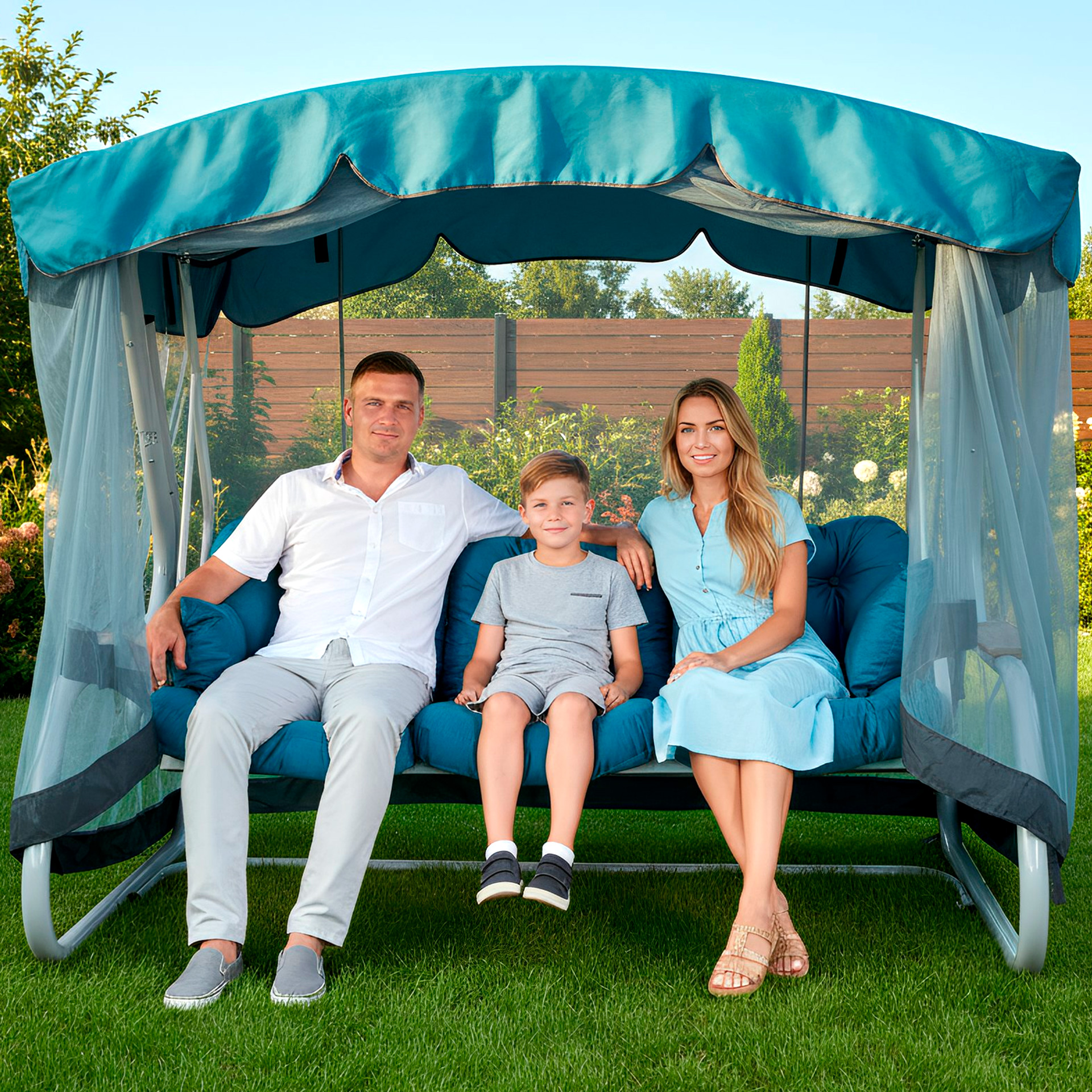 Садовая качеля имеет большие габариты и рассчитана на 3-4 человек общей массой до 400 кг.