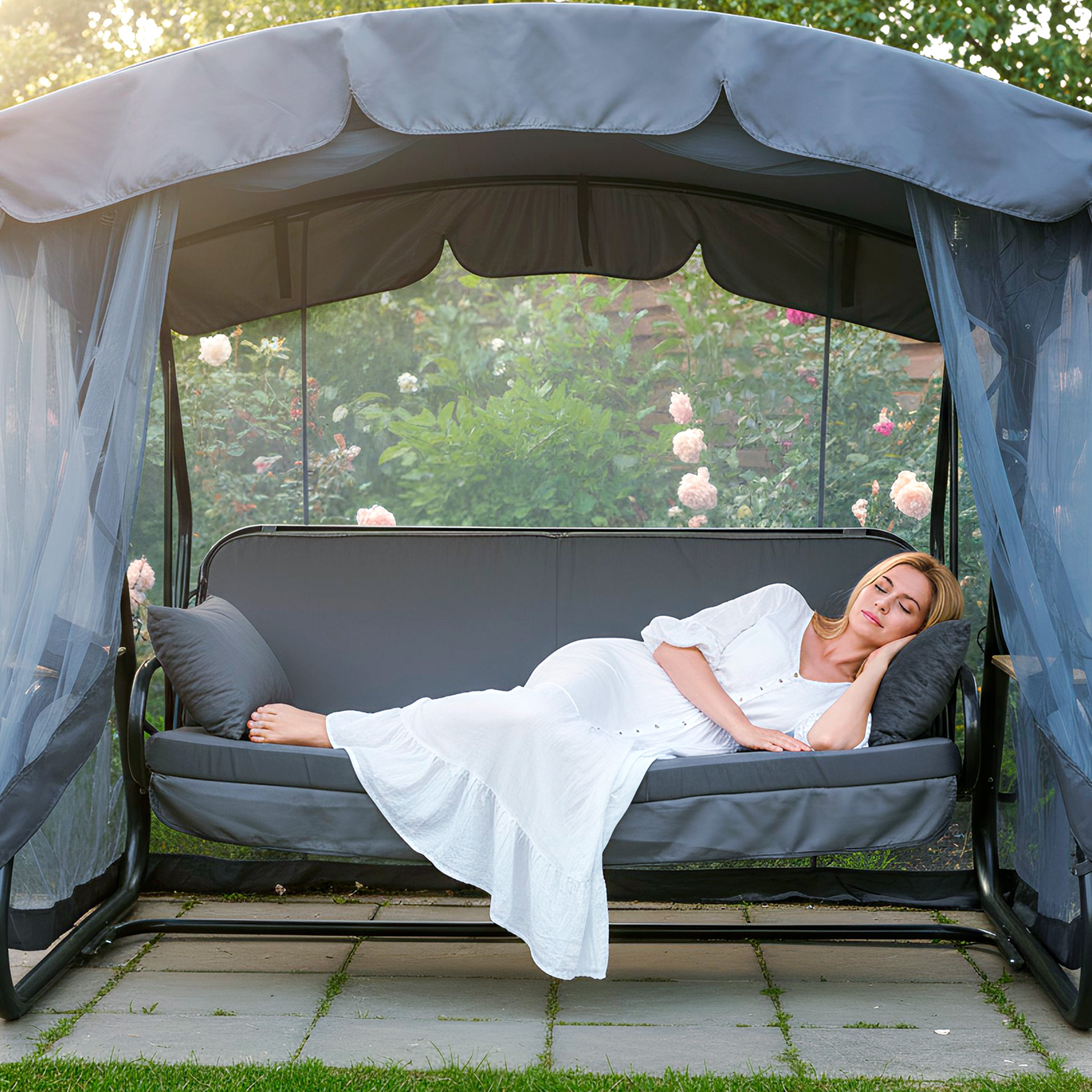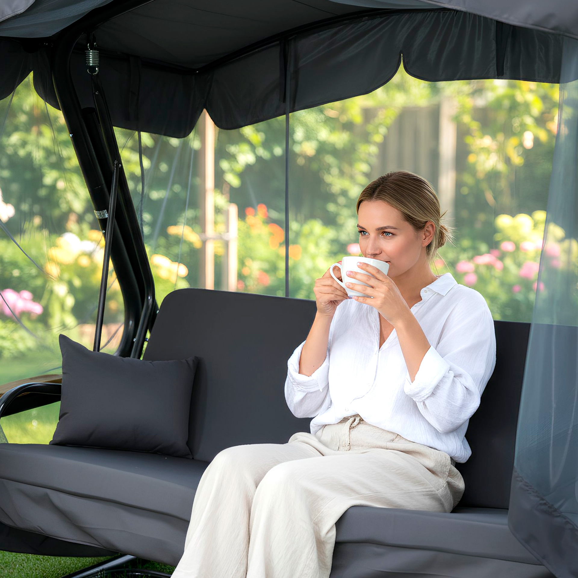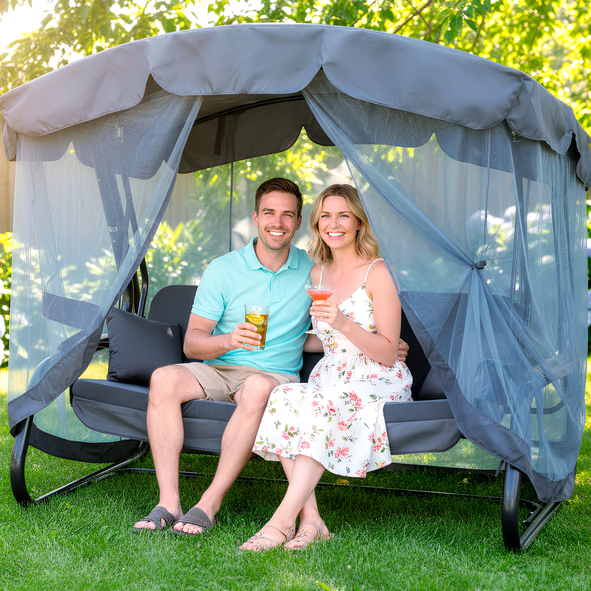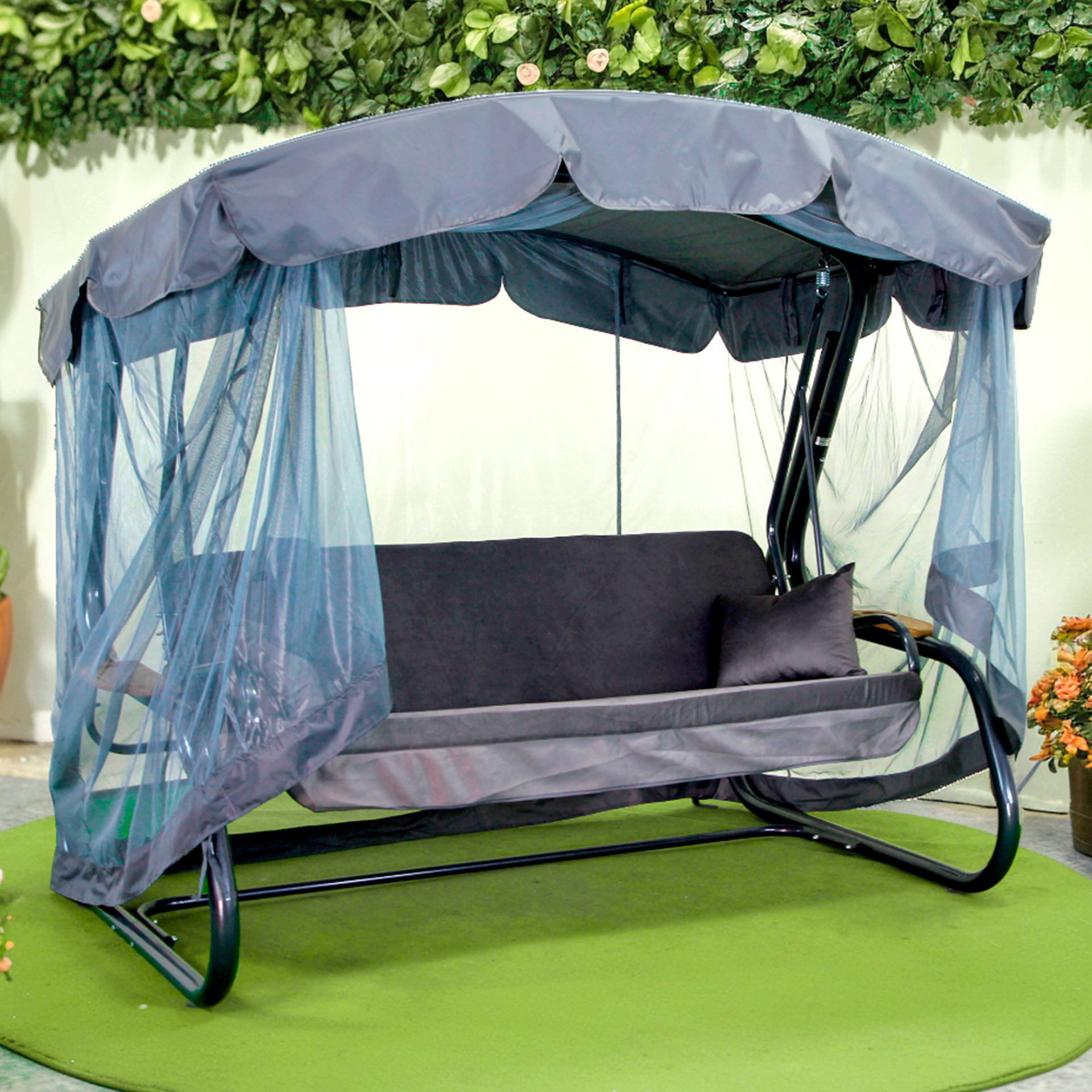 Гарантійний термін експлуатації гойдалки - 12 місяців з моменту реалізації (дати продажу). Гарантія діє на каркас, сидіння (металеву зварну сітку), пружини підвісів. Гарантія не розповсюджується на мякі частини (подушки), тент і москітну сітку.