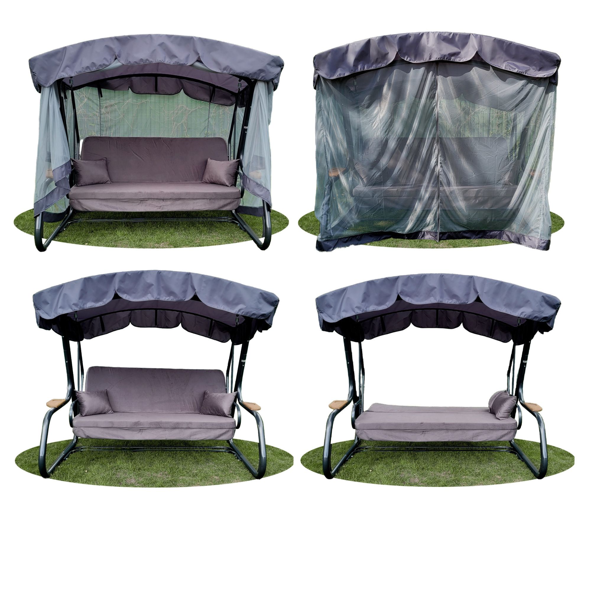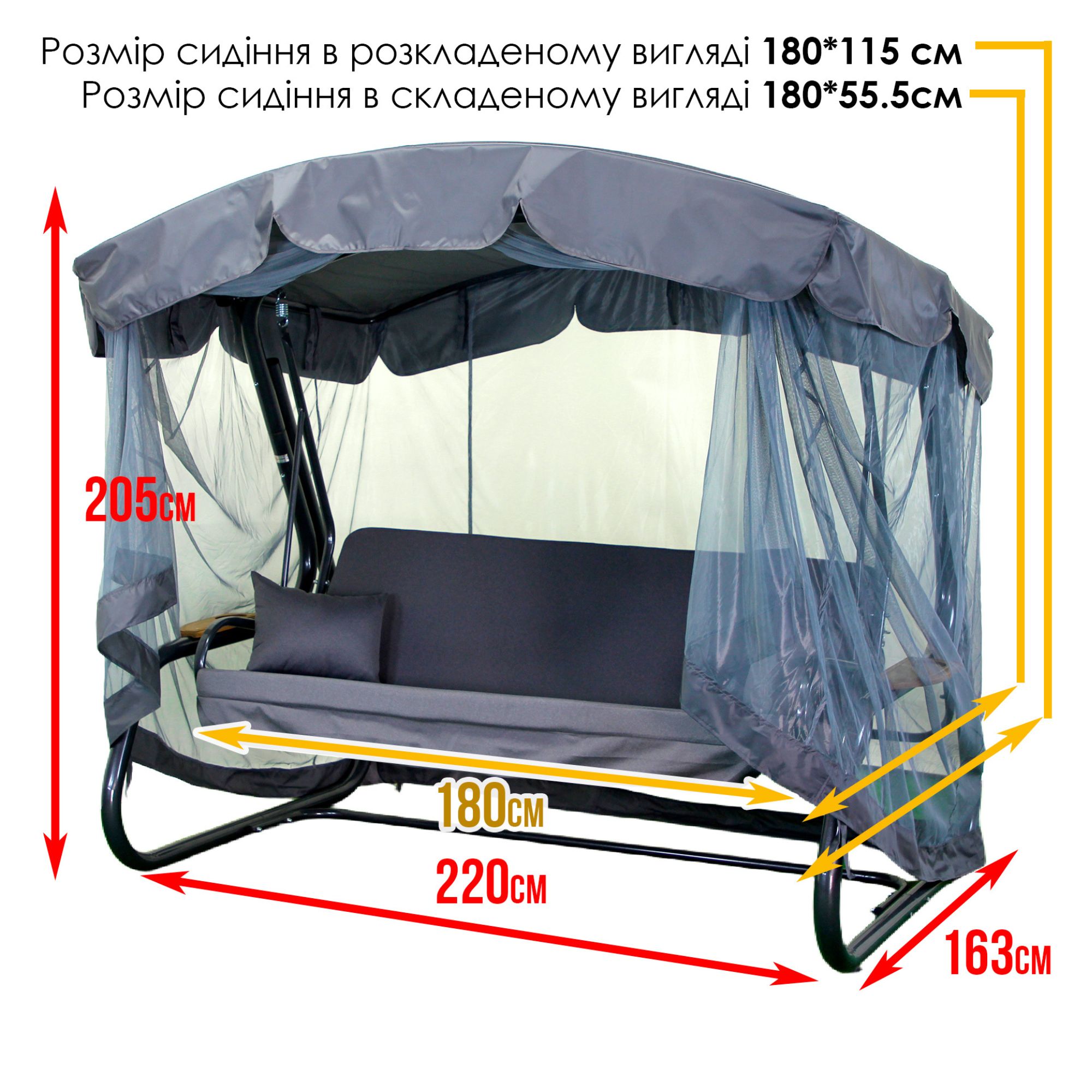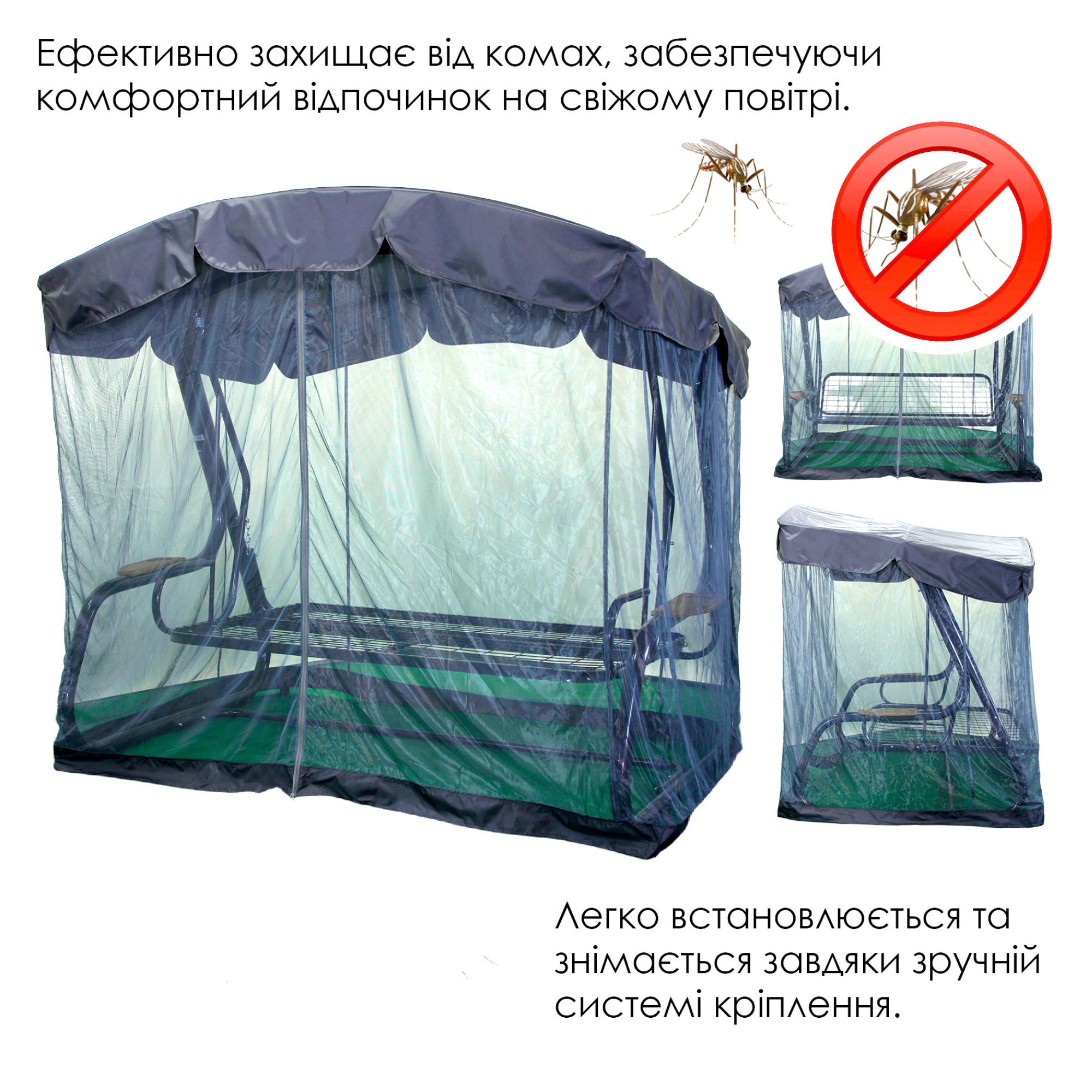 Антимоскітна сітка входить в комплектацію даної моделі! Також в комплектацію входять зручні деревяні полички з обох боків гойдалки.