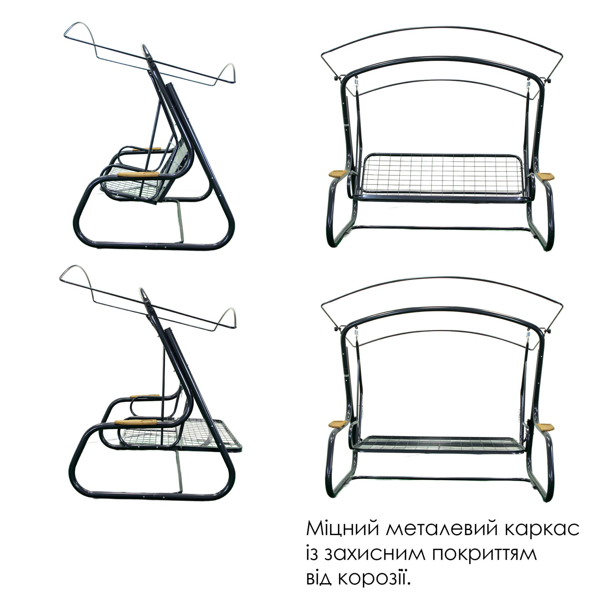 Антимоскітна сітка входить в комплектацію даної моделі! Також в комплектацію входять зручні деревяні полички з обох боків гойдалки.
