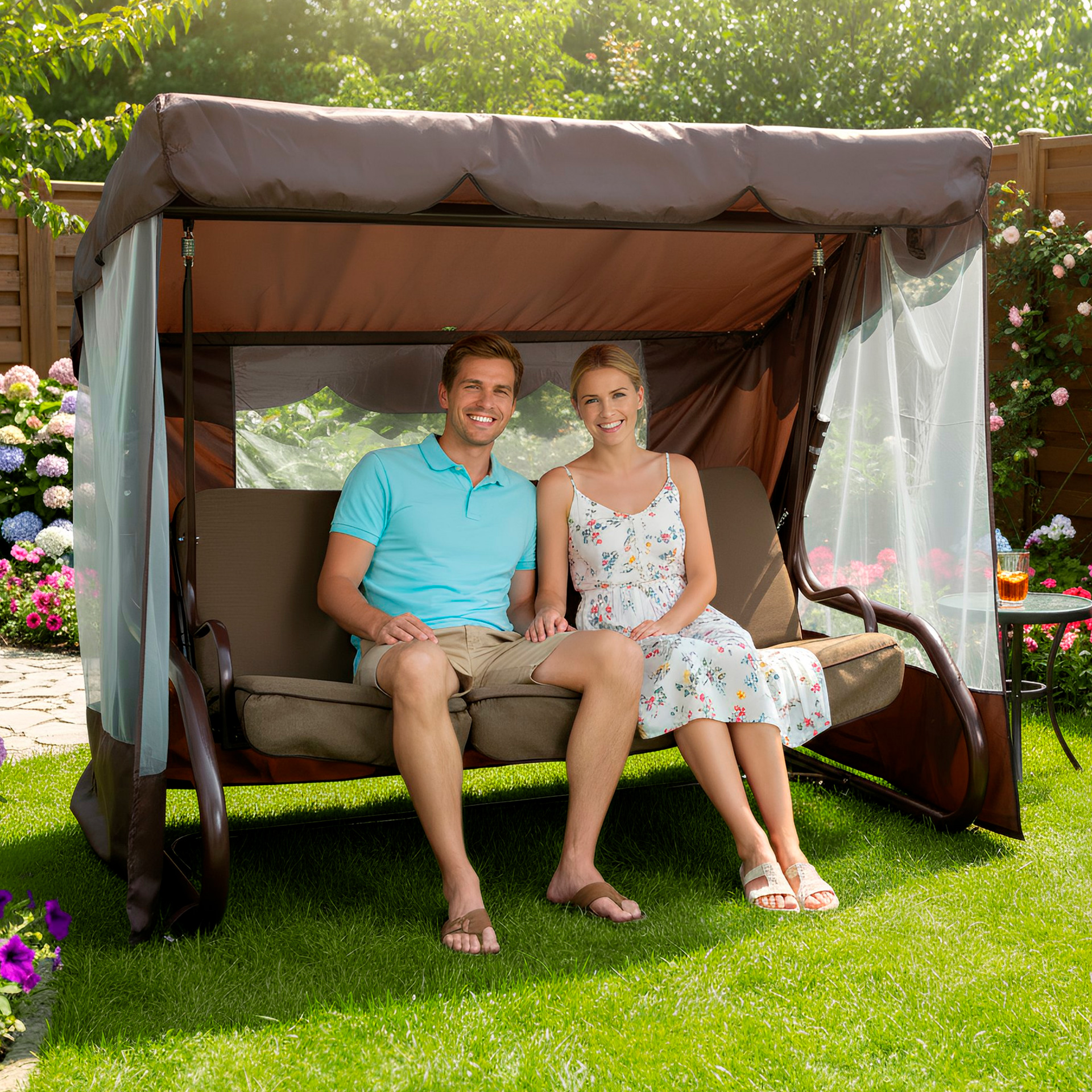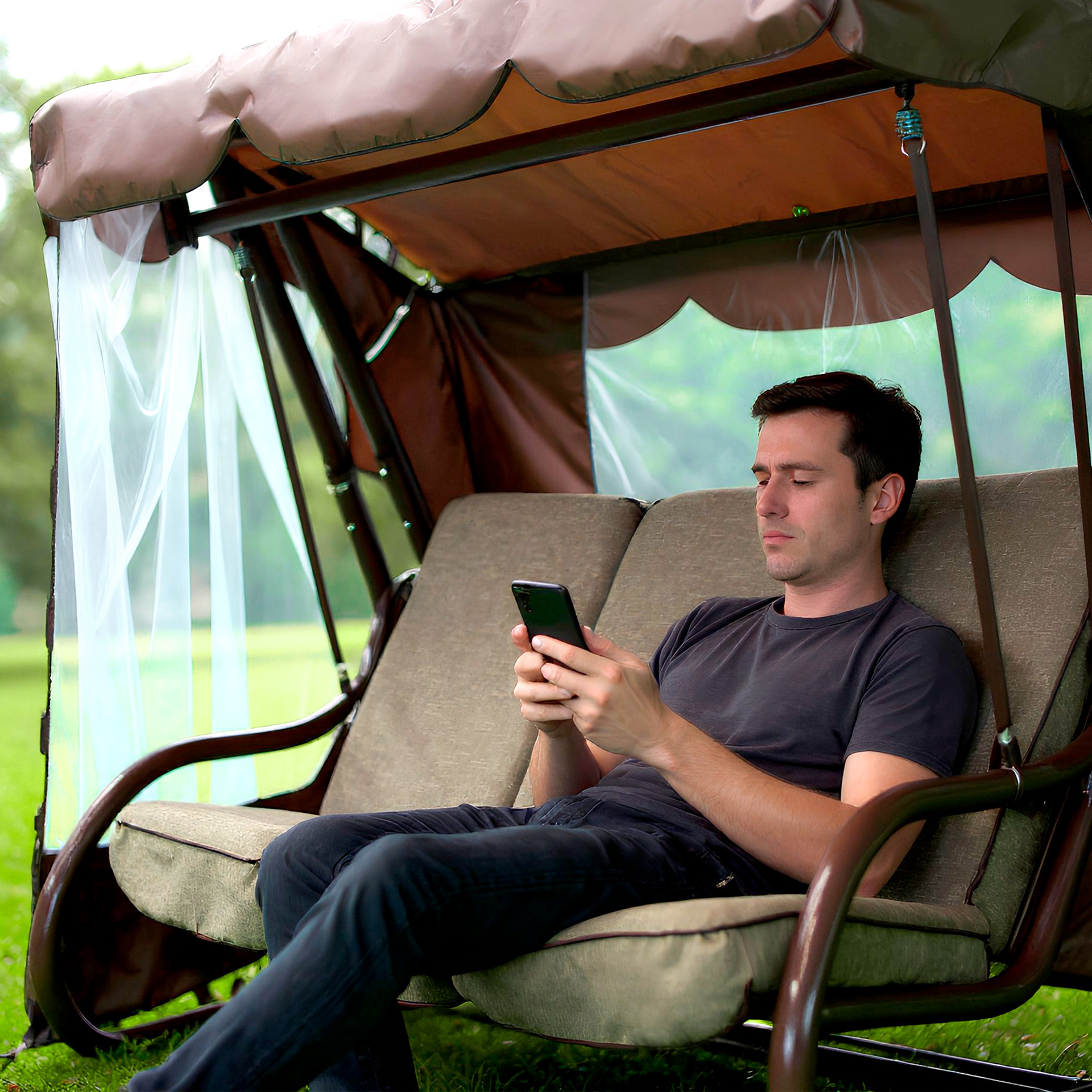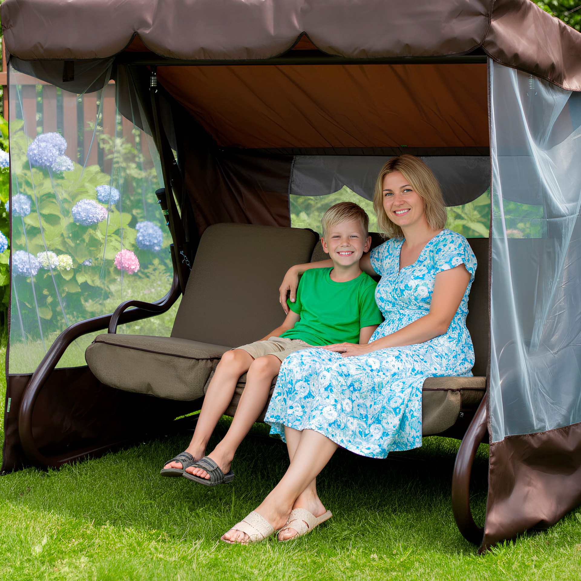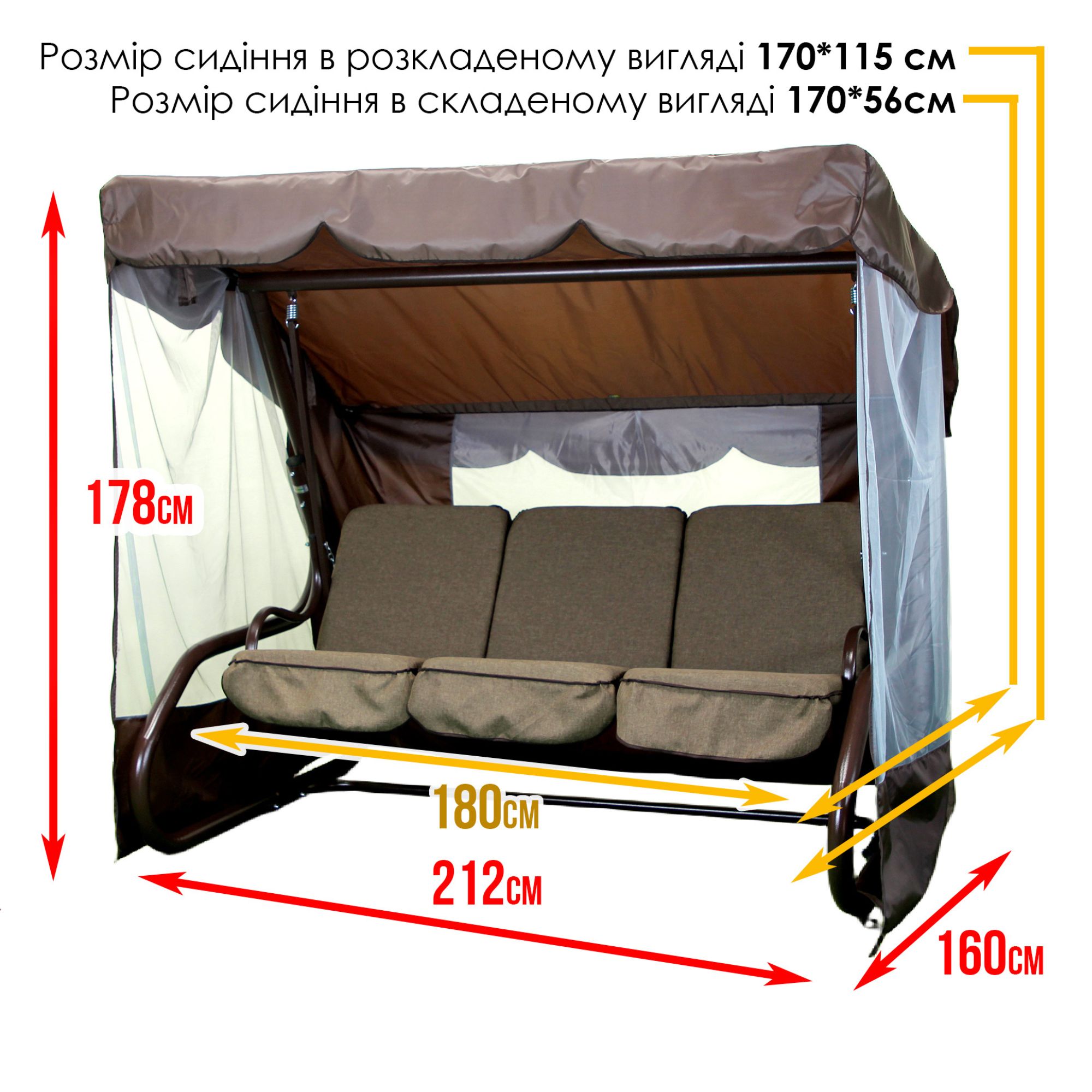 Садова гойдалка Брауні класичного коричневого кольору, з відкидною спинкою і москітною сіткою (тент — коричневий або бежевий на вибір).
